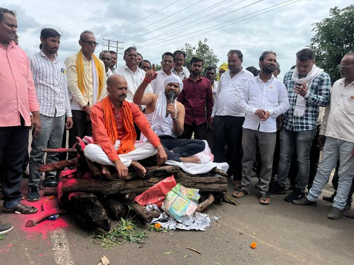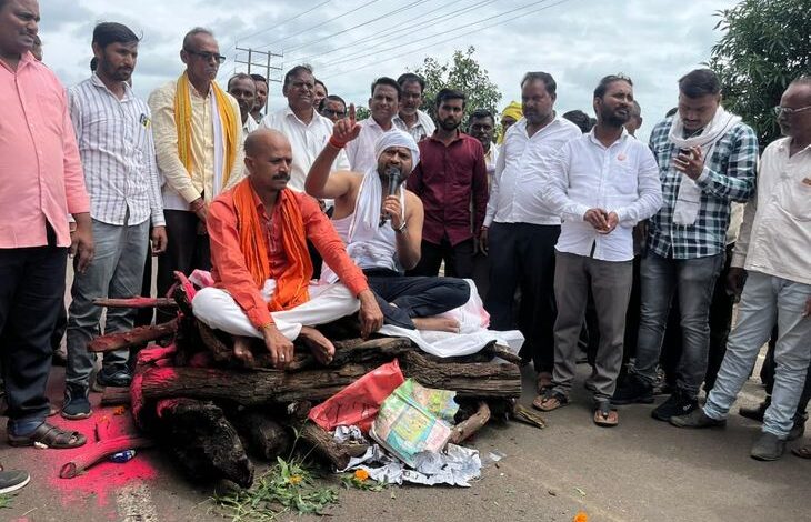 कनेरगावनाका ते जिंतूर मार्गावर हाताळा पाटी येथे क्रांतिकारी शेतकरी संघटनेच्या पदाधिकारी व शेतकऱ्यांनी सोमवारी ता. 29 सकाळी दहा वाजल्या पासून चितेवर बसून आंदोलन केले आहे. सरसकट कर्जमाफीसह ओला दुष्काळी जाहिर करण्याच मागणी यावेळी करण्यात आली. या आंदोलना