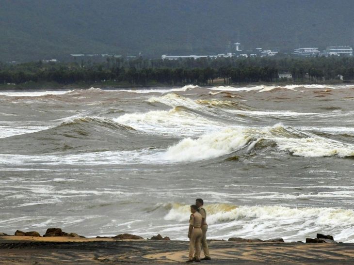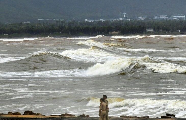 विशाखापट्टनम में चक्रवात के प्रभाव से समुद्र में ऊँची-ऊँची लहरें उठीं।