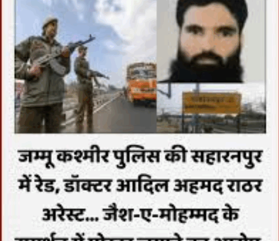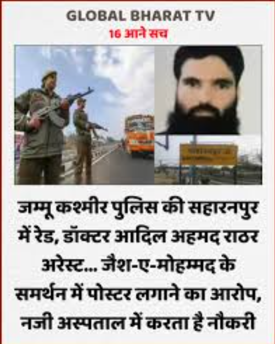 सहारनपुर में तैनात एक निजी अस्पताल के डॉक्टर को जम्मू-कश्मीर पुलिस ने आतंकी संगठन जैश-ए-मोहम्मद के समर्थन में पोस्टर लगाने के आरोप में गिरफ्तार किया है। आरोपी की पहचान डॉ. आदिल अहमद राठर, निवासी अनंतनाग, के रूप में हुई है। पुलिस ने बताया कि श्रीनगर के कई इलाकों में ऐसे पोस्टर मिलने के बाद सीसीटीवी फुटेज के आधार पर जांच शुरू की गई थी।